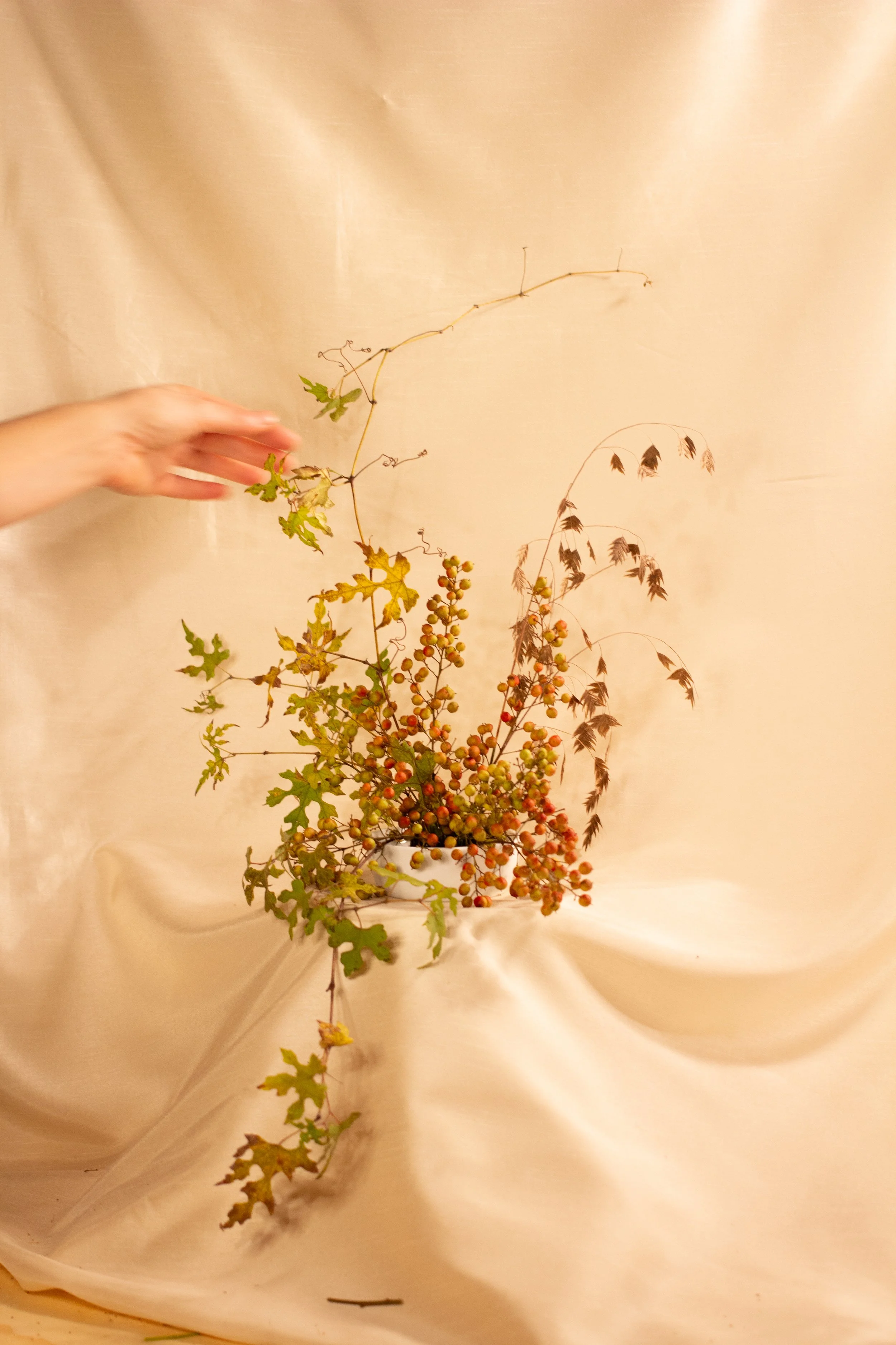 I take pleasure in finding beauty in species and materials outside the mainstream of the floral design industry to create spirited, sculptural compositions rooted in local ecology. For me, plants are collaborators rather than mere materials. Inspiration arises from their presence as living beings, as well as their colors, textures, and shapes. My floral design is improvisatory by nature, following the plants’ character and natural tendencies to find balance and harmony.